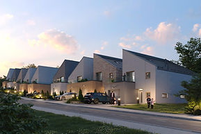 Domy w zabudowie szeregowej połączone jedynie bryłą garażu.